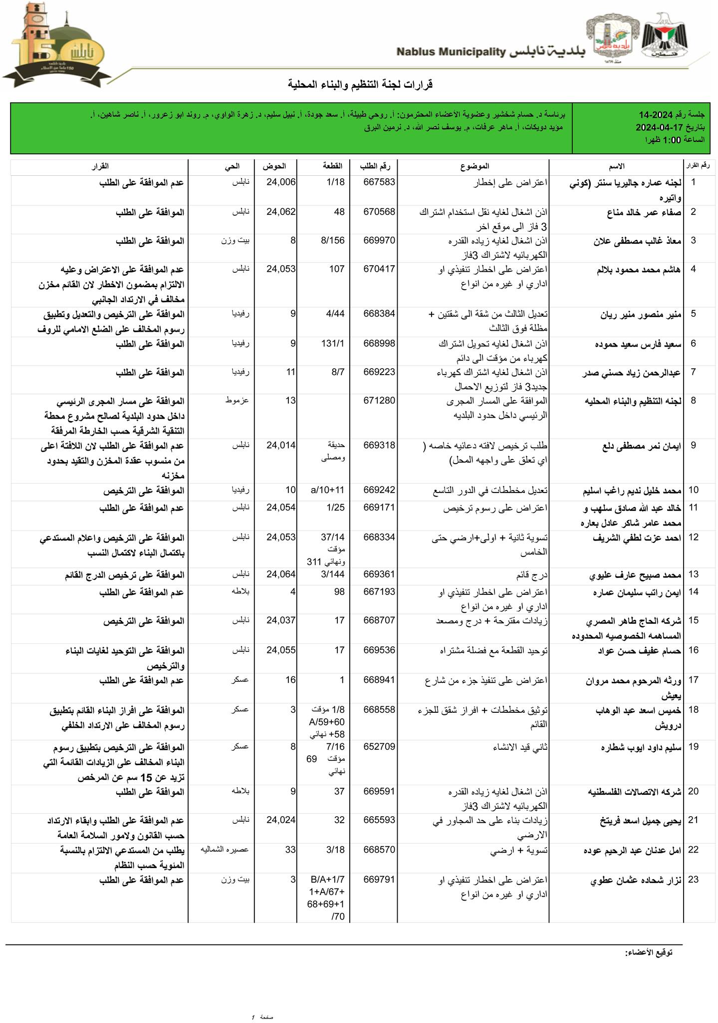 قرارات جلسة التنظيم والبناء المحلية بتاريخ 17-4-2024